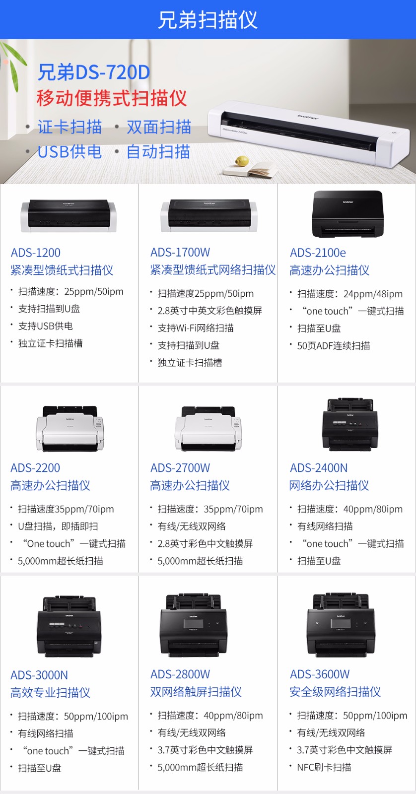 兄弟ADS-2700W 高速馈纸式办公扫描仪A4自动双面有线网络无线WIFI批量扫描